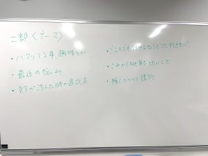 前回、話す内容に困ったという意見があったので、今回はグループで話すお題をスタッフで用意しました。